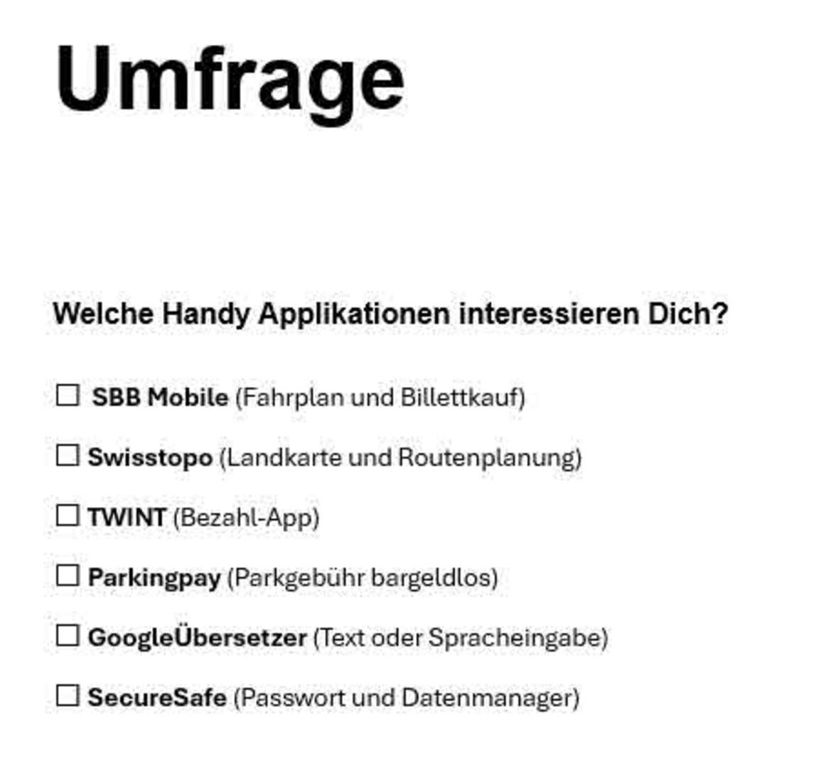 Bitte markiere unten im Umfrage-Formular alle Applikationen, über die Du mehr erfahren möchtest.